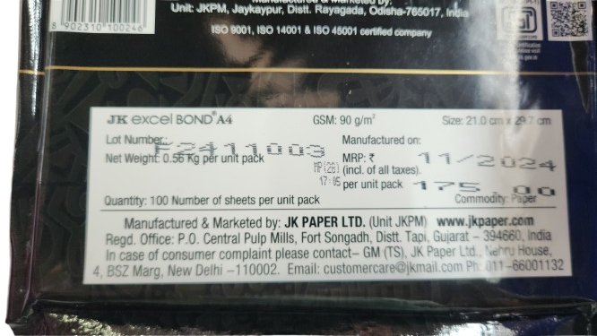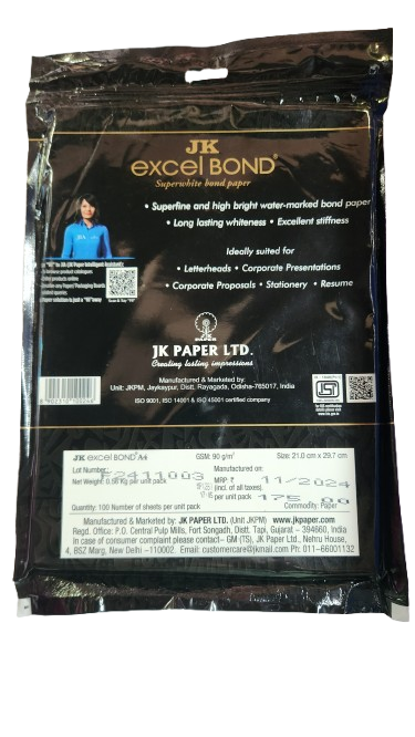 A4 PAPER JK BOND with 90 GSM with a pack of 100 sheets, ideal for presentations, resumes, project reports, and corporate and personal letterheads and fully compatible with laser and inkjet printers.