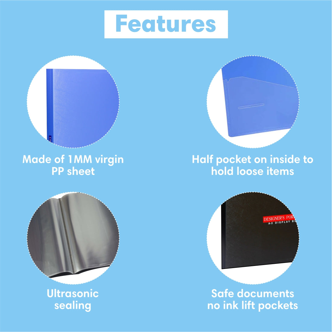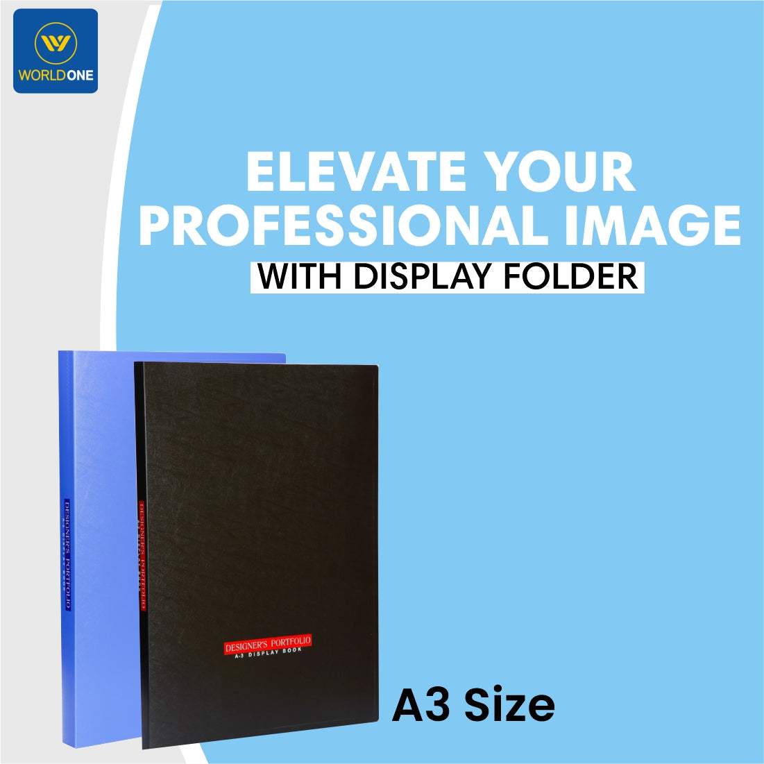 Worldone A3 Size Display File of MRP 450 with 40 binder sleeves. A3 Display Folder is made of high-quality PP material, which is water and dust resistant, highly durable, and sturdy. The corners of the folder are extra smooth, and the surface is flat.